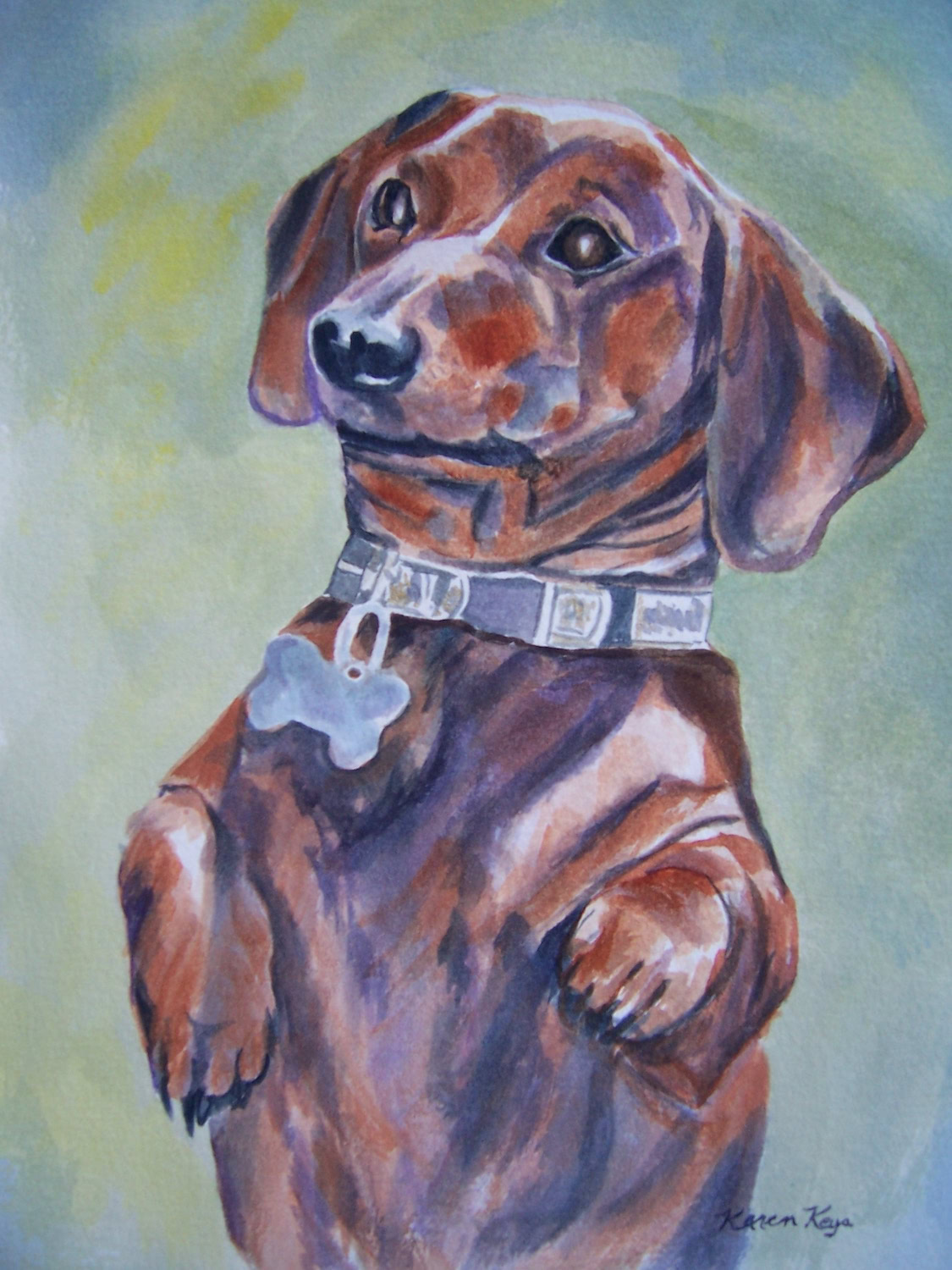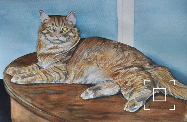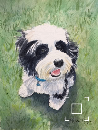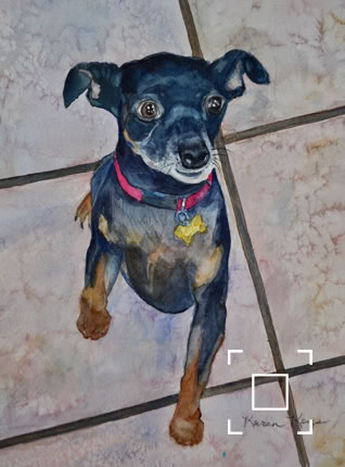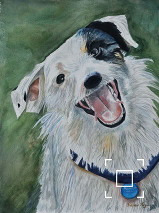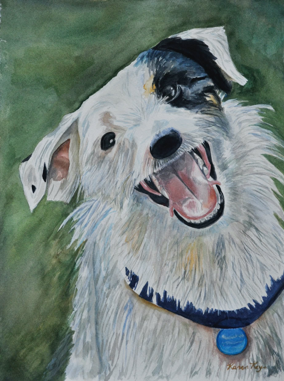 My standard commissions are painted in watercolor, 11xx14, mostly dogs and cats, (sometimes fish!), matted and protected in a glassine envelope for $150. I have also been commissioned to paint birds, horses, cows,